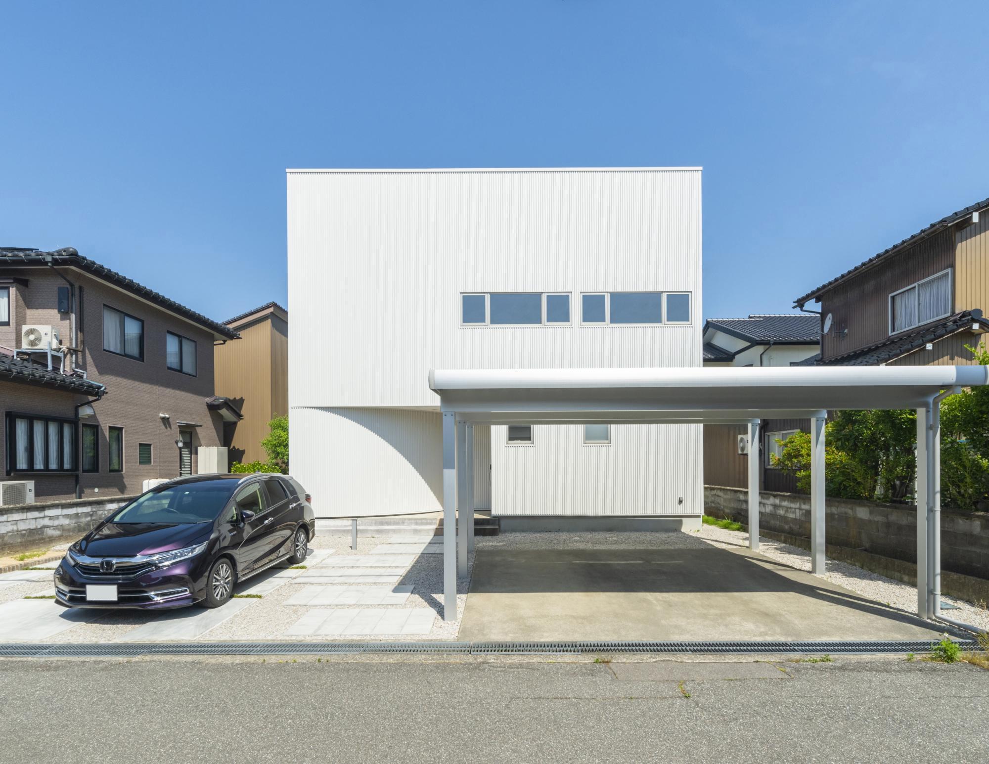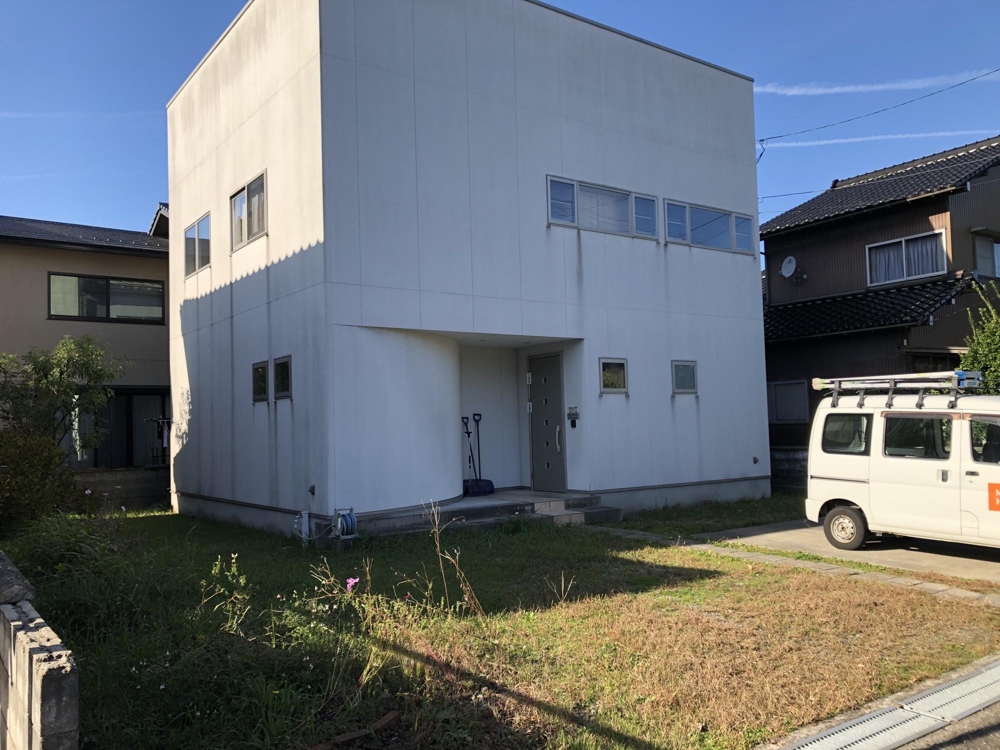 築14年のO邸。新築当時は窯業系サイディングの白色でしたが雨だれが目立ち凍害も発生して来たため、ガルバリウム鋼板のスパンドレルで外壁をリフォーム。こちらのお宅は相当外壁の凍害が進んでいたため、カバー構法ではなく外壁を全て解体し、ガルバリウム鋼板のスパンドレルを施工しました。