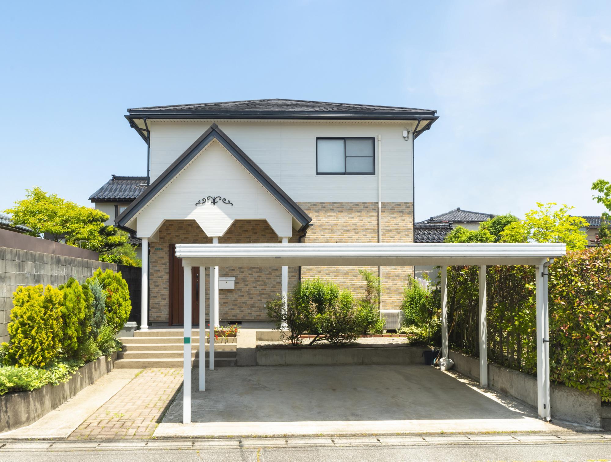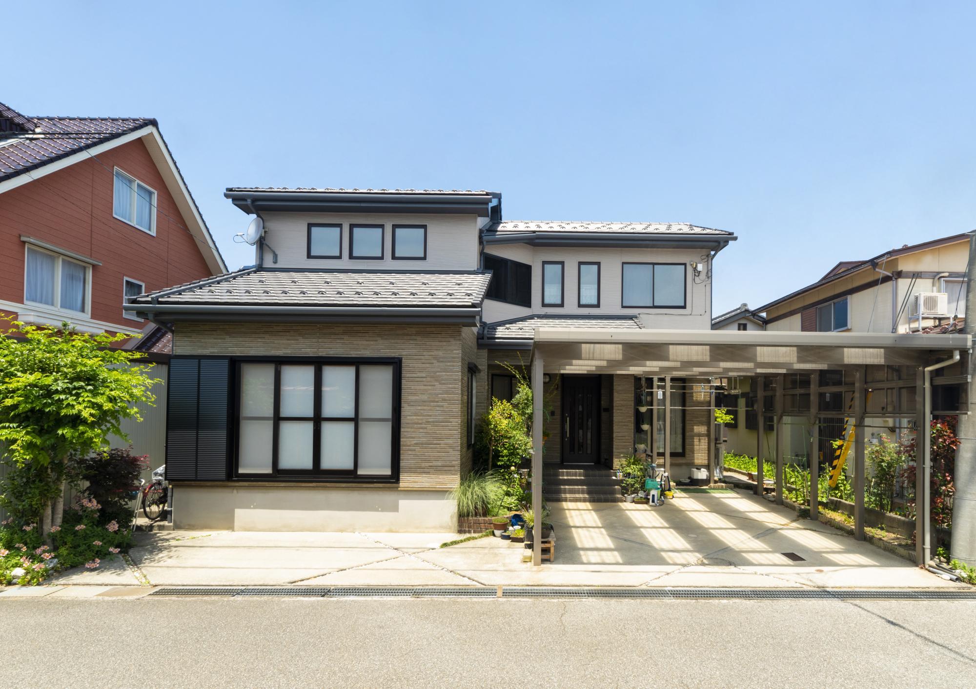 築24年のO邸。汚れが目立ち剥離してきた外壁を、窯業系のサイディングから金属系のいわゆるガルバリウム鋼板の外壁にリフォームしました。外壁は1階と2階の2トーンに分け、玄関の上にあった飾りの空気孔は取り外し、アイアンの装飾を施しています。