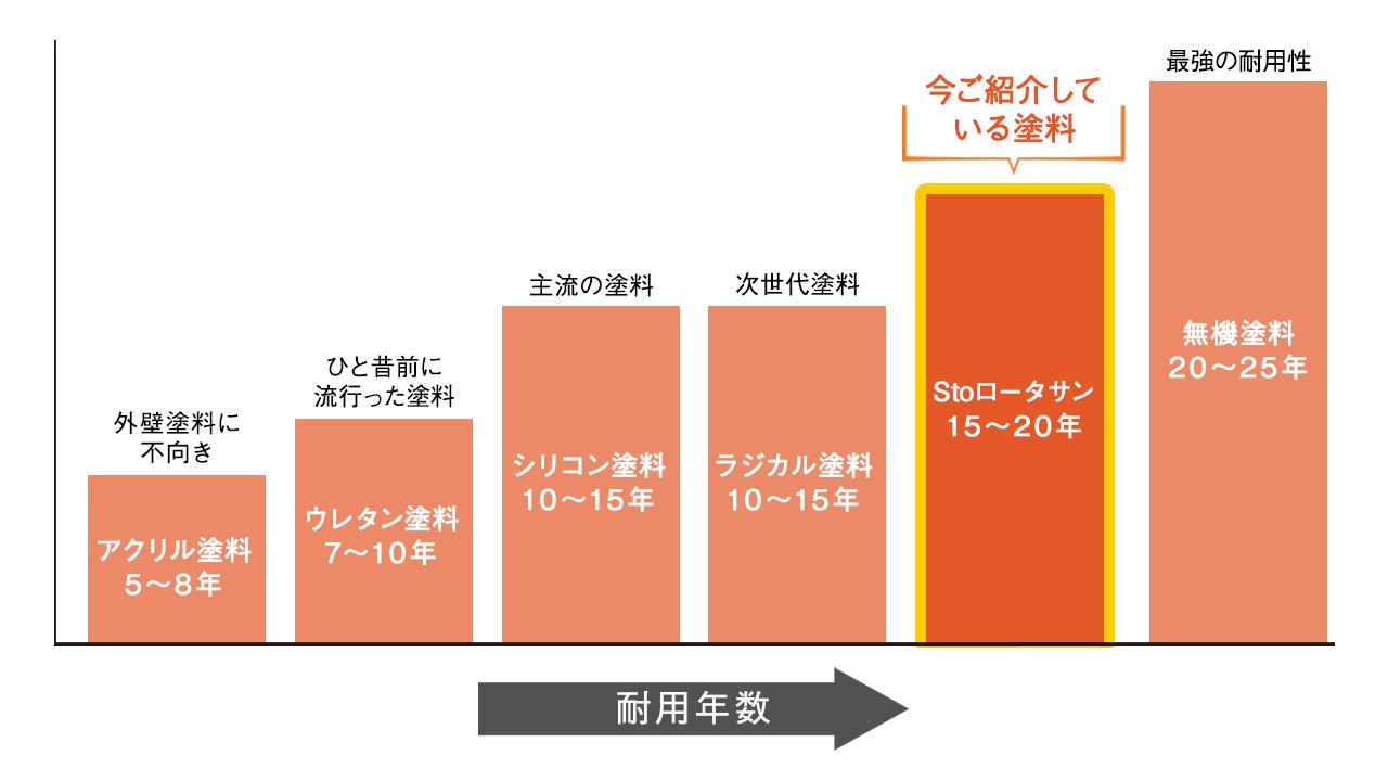 日本で使用されている一般的な4つの外壁材と比べても耐久性が高く、長く綺麗な住まいを保つことができます。