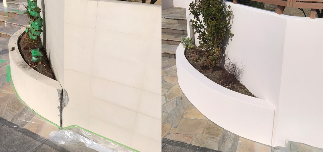 擁壁が劣化し剥がれ落ち、つなぎ目の汚れやなどが目立っていました。