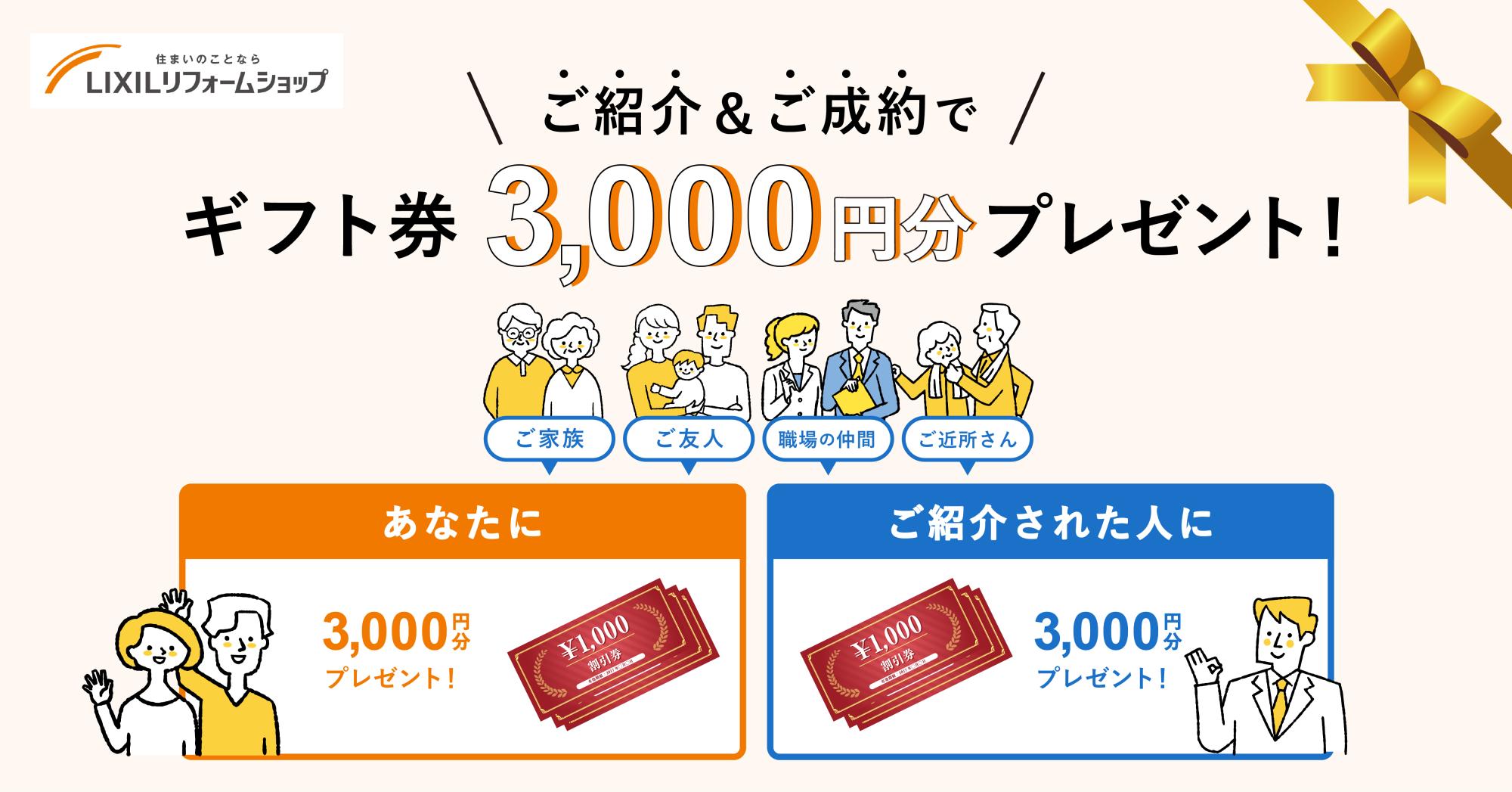ご成約となった場合、ご紹介者様・ご紹介先様の双方にギフト券3,000円分をプレゼントいたします。