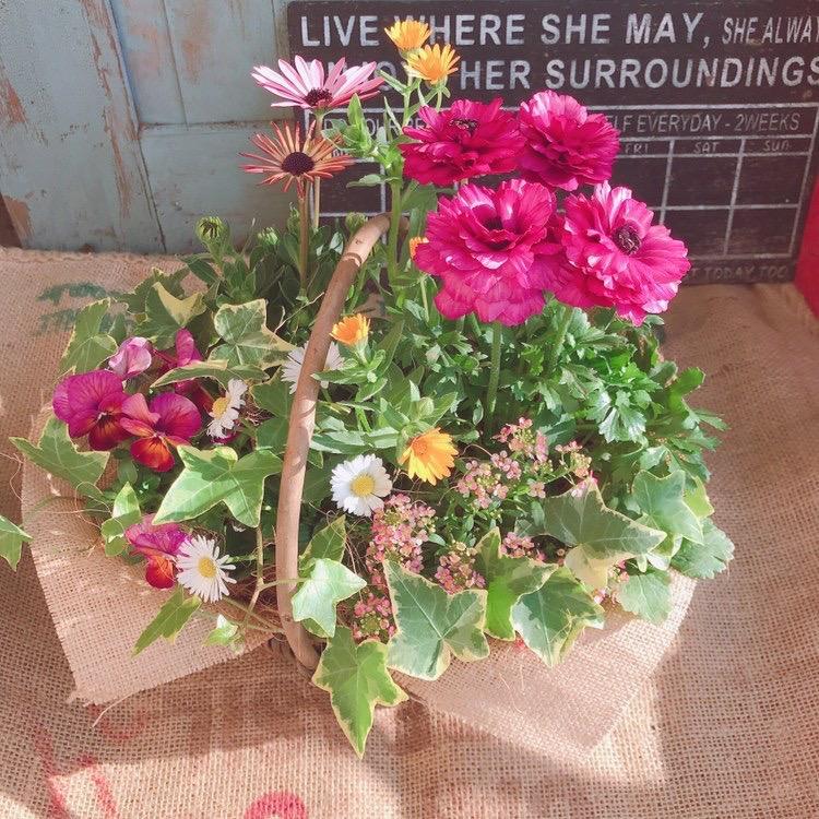 ナチュラルなカゴバスケットに早春の花苗をキュッと植え込んでみませんか?