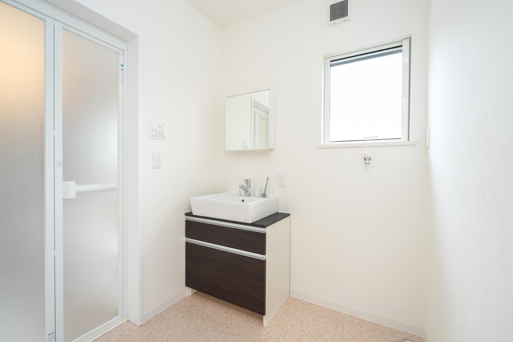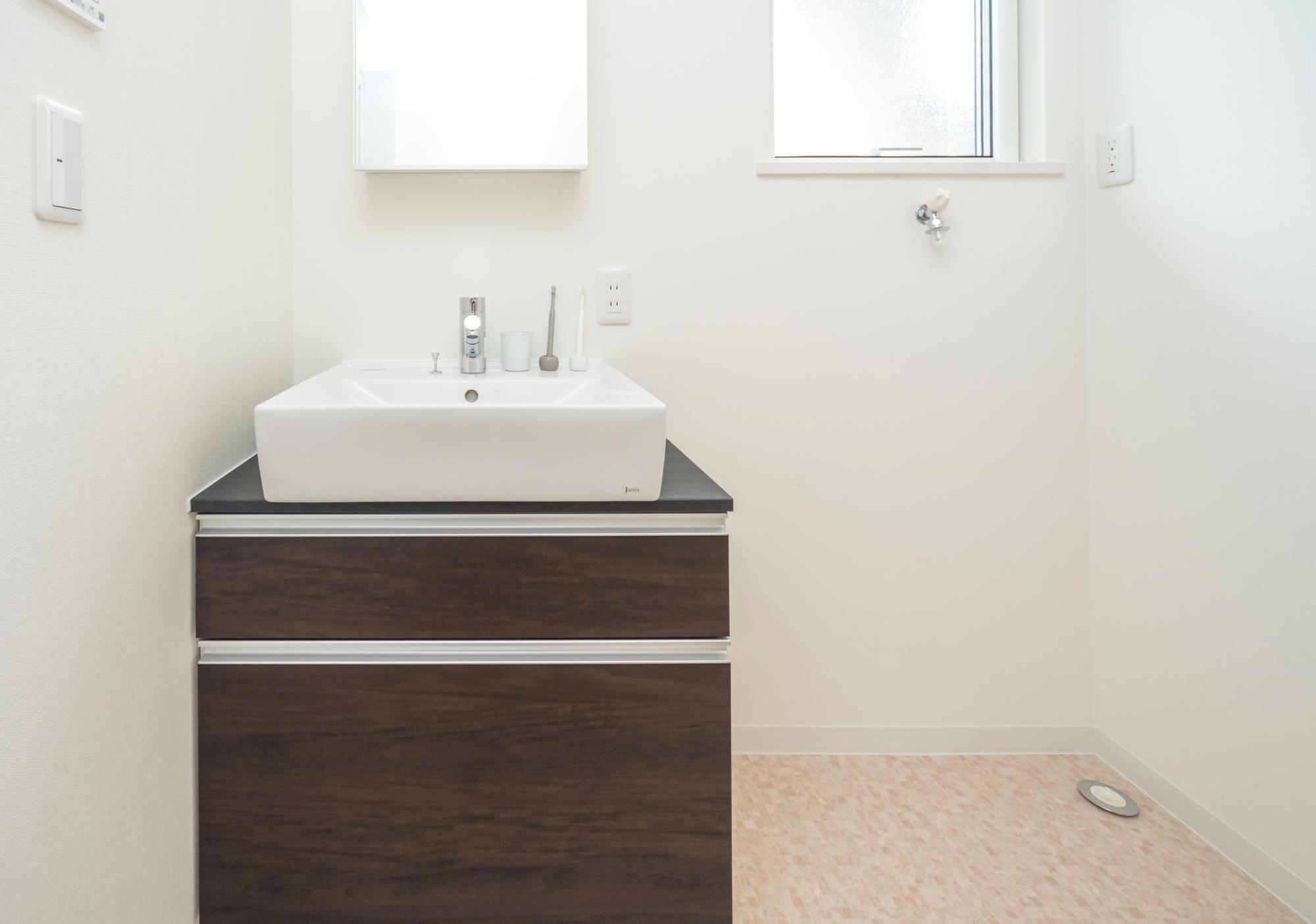 シャープな印象のボールデザインとレール引き手がおしゃれな洗面台。