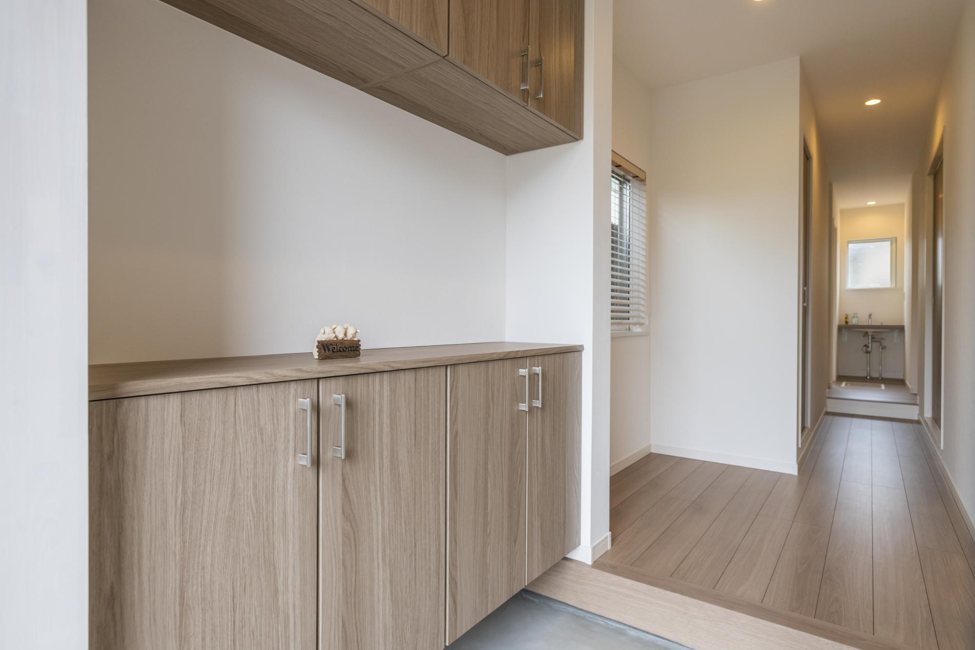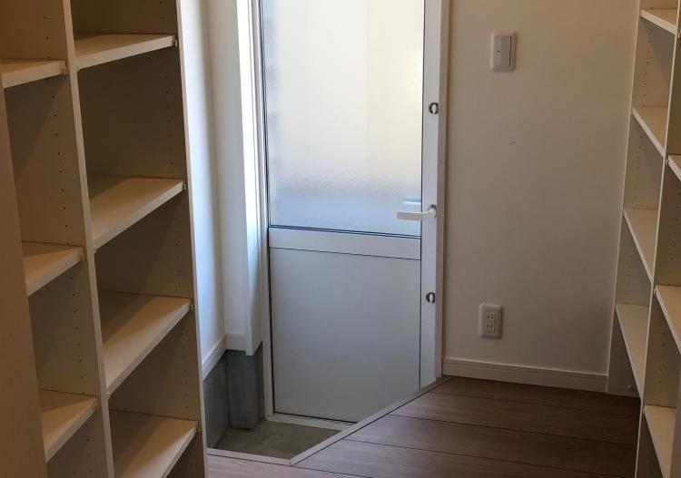 勝手口からキッチンに向かう動線には大容量のパントリーを設けました。