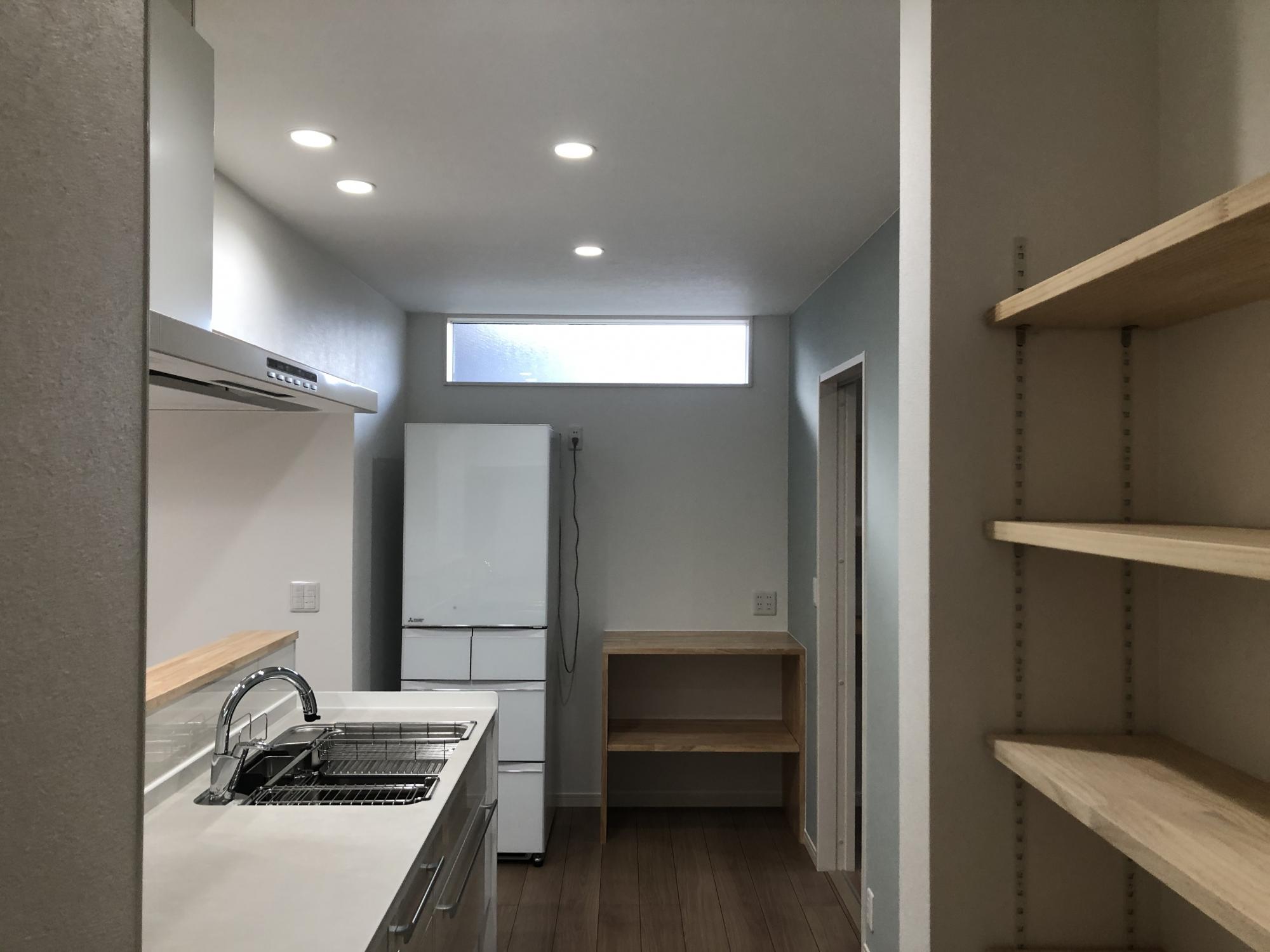 またキッチンの横にはたっぷりの収納棚を設置。物がすぐに取りに行けるので家事も楽になります。